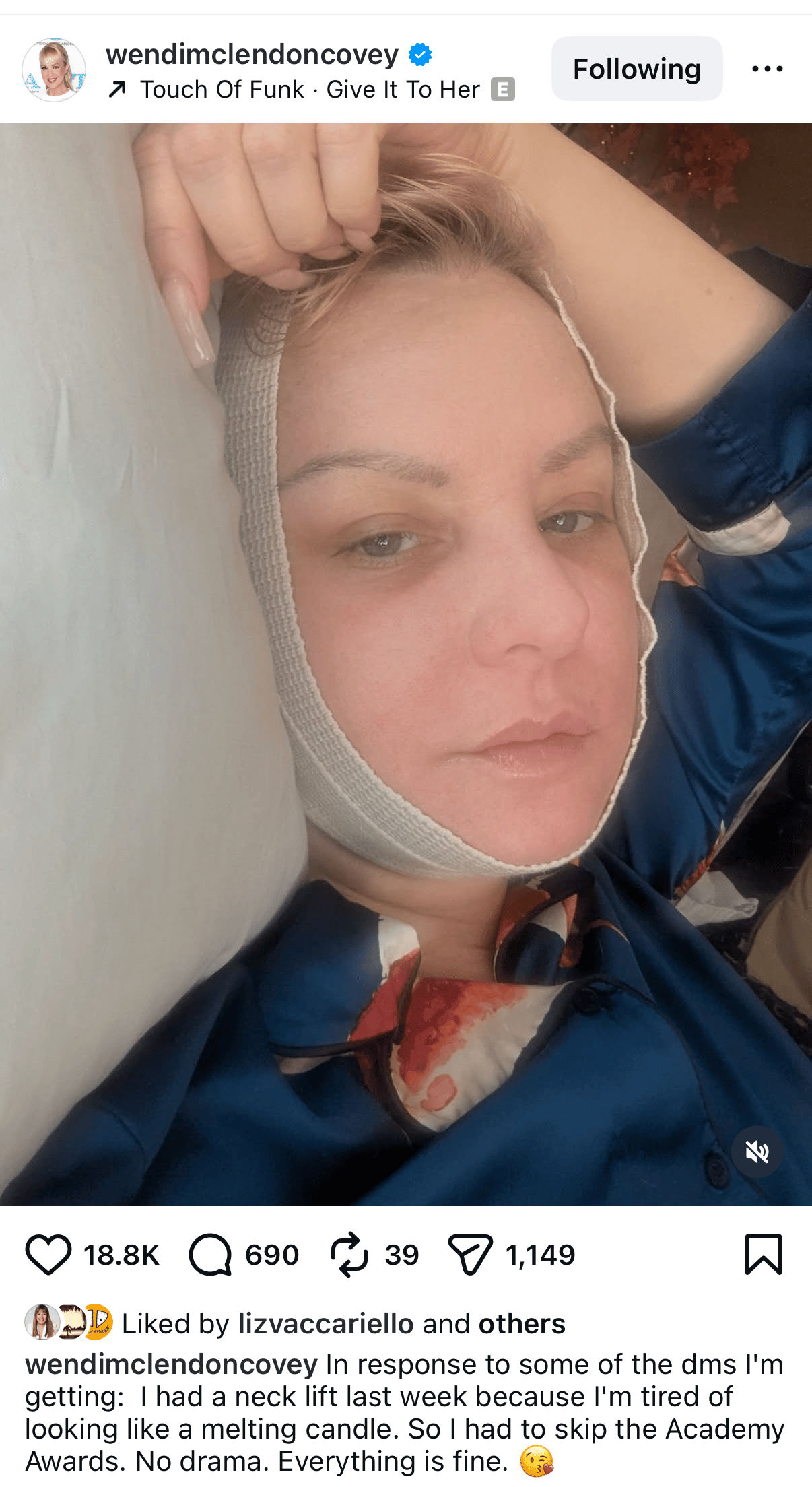 I loved this year’s Oscars, but my favorite moment did not occur at the ceremony or the after-parties; it took place in the TV bedroom of Wendi McLendon-Covey’s home in Signal Hill, California. Many people wondered why the comedy legend was absent from the Bridesmaids 15th-anniversary reunion. While Kristen Wiig and Maya Rudolph traded jokes, Wendi was actually home in bed. She revealed on Instagram that she had just undergone neck lift surgery the week prior. To quell "feud" rumors, she posted a photo in her recovery bandages, joking that she was tired of looking like a "melting candle." It wasn't drama—just bad timing.